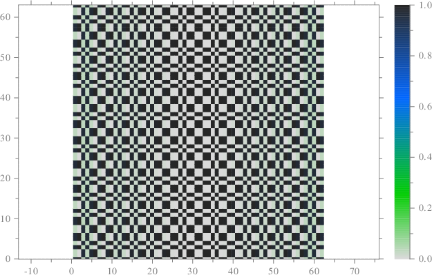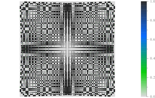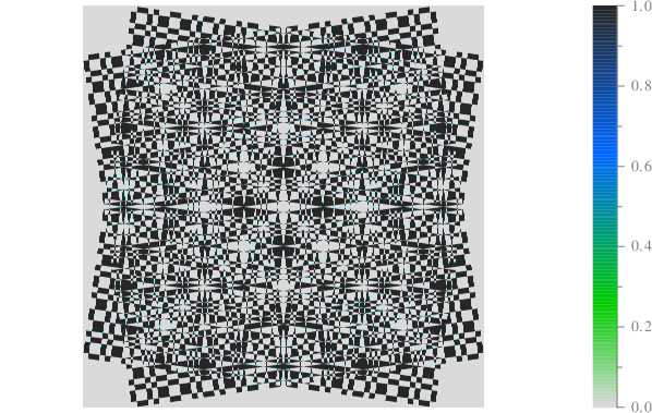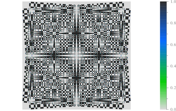 int prouhethuemorse_cpt(double phi_deg){ scltracefa(§, ƒ, ); scltracefc("scl-%s (%s) : %s\n", sclver(), sclsec(), temps_char(0)); int pn = 6; int mn = 1<<pn; // 2^6=64 int dn=2*pn/*log(mn^2)/log(2)*/, di; double *q=new double[1]; q[0]=0; int qn=1, qi; double *r=; int rn=0, re=0; // Génération de la séquence for (di=0;di<dn;di++){ r=; rn = 0; re=0; for (qi=0;qi<qn;qi++){ if (q[qi]>0){ // r = { r, 1, 0 } queuetab<double>(&rn, &r, &re, 1); queuetab<double>(&rn, &r, &re, 0); } else{ // r = { r, 0, 1 } queuetab<double>(&rn, &r, &re, 0); queuetab<double>(&rn, &r, &re, 1); } } delete[] q; q=r; qn=rn; } double **mr = matresse<double>(mn, mn, r); scl::string_c imgname=scl::string_c(ƒ)+".pdf", imgpath="./srt/"+imgname; grafmat_dis(imgpath.c_str(), mn, mn, mr, "axis", "equal", "colormap", "rhiver", "linespeca", "-a", ); // Facteur de suréchantillonnage int en = (int)round((107)/((double)mn)); int xn=mn*en, yn=mn*en, xi, yi; double **rmat=newmat<double>(xn, yn); for(xi=0;xi<xn;xi++){ for(yi=0;yi<yn;yi++){ rmat[xi][yi]=mr[xi/en][yi/en]; } } // Rotations int xr, yr; void **trn = tournemat(xn, yn, rmat, phi_deg, 1, 1, &xr, &yr); double **rmatplus = (double**)trn[0]; int **rinplus = (int**)trn[1]; /*delete[] */free(trn); /* */trn = tournemat(xn, yn, rmat,-phi_deg, 1, 1, &xr, &yr); double **rmatmnus = (double**)trn[0]; int **rinmnus = (int**)trn[1]; scltracefc("xn: %d, yn: %d, xr: %d, yr: %d\n", xn, yn, xr, yr); // Superposition (plus xor mnus) double cp, cm, cr; int ir; for(xi=0;xi<xr;xi++){ for(yi=0;yi<yr;yi++){ cp = /*ceil*/(rmatplus[xi][yi]); cm = /*ceil*/(rmatmnus[xi][yi]); /*if(cp>1.0){ cp=1.0; } if(cm>1.0){ cm=1.0; }*/ if(rinplus[xi][yi]>0){ if(rinmnus[xi][yi]>0){ cr=cp+cm; } else{ cr=cp; } } else{ if(rinmnus[xi][yi]>0){ cr=cm; } else{ cr=0; } } ir = ((int)round(cr))%2; rmatplus[xi][yi] = (double)ir; } } imgname.clear(); imgname=scl::string_c(ƒ)+"_"+num_str<double>(phi_deg)+".pdf"; imgpath.clear(); imgpath="./srt/"+imgname; grafmat_dis(imgpath.c_str(), xr, yr, rmatplus, /*"instatus", rinp2,*/ "axis", "equal", "axis", "off", "linespeca", "-a", "colormap", "rhiver", ); //-------------------------------------------------------------------------- //[>LIBERE MEMOIRE] //-------------------------------------------------------------------------- deletemat<int>(xr, &rinmnus); deletemat<double>(xr, &rmatmnus); deletemat<int>(xr, &rinplus); deletemat<double>(xr, &rmatplus); deletemat<double>(xn, &rmat); delete[] mr; //-------------------------------------------------------------------------- //[<LIBERE MEMOIRE] //-------------------------------------------------------------------------- scltracefe(§, ƒ, ); return 0; } /* ƒ décorée par 🔬 le 08-03-2025 08:06:32 */